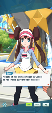 - Pendant que Mélis est en train de livrer ses combats durant le tournoi des Néo-Maîtres, Écho et Matis s'occupent d'aider Meloetta, le Pokémon fabuleux qui aime chanter et danser, afin qu'il puisse se détendre lors de ses prestations devant un public. Matis est content des progrès du Pokémon, mais Écho pense qu'il a encore besoin de gagner en assurance pour se représenter devant un public. Ils décident néanmoins que leurs efforts sont suffisants pour aujourd'hui, et lorsqu'ils reviennent en ville, ils apprennent par Tcheren et Bianca que le nouveau Néo-Maître est leur ami Mélis !