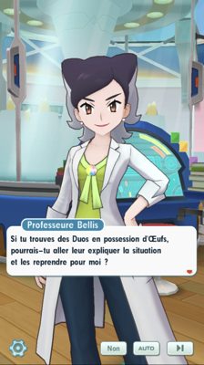 - À son laboratoire, la Professeure Bellis vous demande votre aide ! Il semblerait que tous les Oeufs de Magicarpe qu'elle a rassemblé pour ses recherches ont disparu et que Hoopa ait donc décidé de faire une nouvelle farce en échangeant ceux qu'elle donne habituellement en les remplacant par des Oeufs de ce Pokémon...