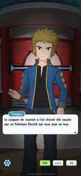 - Vous retrouvez Tanguy devant le Centre Pokémon et il vous indiquer qu'il s'est produit quelque chose de bizarre de son côté. D'après ses premières observations, des câbles électriques auraient été mâchonnés et il suspecte que ce soit l’œuvre d'un Pokémon Électrik. Il s'apprête à réparer les câbles et vous demande de l'accompagner. Que vous acceptiez ou non de le suivre, l'épisode s'arrête ici, avec une réaction un peu étrange de sa part...