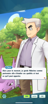 Au fil de la discussion vient la question de pourquoi le Professeur combat-il avec un Nidorino au lieu de le faire évoluer en Nidoking ? Celui-ci se justifie par ses recherches : il a besoin d'étudier chaque Pokémon, et chaque stade d'évolution a ses propres caractéristiques. Il y a aussi une seconde raison qu'il ne dévoile pas mais qui semble reliée à un souvenir de combat contre Ectoplasma.Duo obtenu (★★★★★)