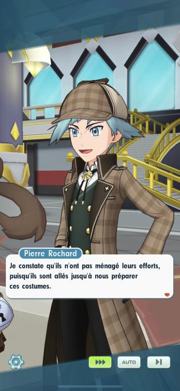 - Bien, il est temps d'attribuer les rôles mais avant Pierre Rochard ainsi que Sannah ont reçu de nouveaux costumes pour l'occasion : vous apprenez alors que le Maître de Hoenn sera donc le détective qui dirigera l'enquête et que la Dresseuse de Kalos sera donc son assistante ! Artie le champion d'Unys sera le musicien et Célesta sera un peintre. Quant à Beladonis, bien qu'il est un peu déçu de ne pas avoir eu le rôle espéré, il sera le jardinier. Pour ce qui est d'Agatha, elle sera la propriétaire du manoir.