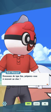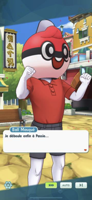 - Le Ball Masqué est fraîchement arrivé à Passio, et en se rendant sur l'une des place de Cordis, il constate que de nombreux Maîtres de Ligues sont présents ! Voyant autant de célébrité, il se dit qu'il a le potentiel de se faire un nom sur la région. Il interpelle un Gamin qui passe par là et lui offre une Copain Ball, mais le jeune garçon lui explique que les Poké Balls ne sont pas très utiles sur l'île puisqu'il n'y a pas de Pokémon sauvages. Choqué par cette nouvelle, il s'évanouit !