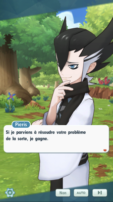 Dans l'incapacité de gagner face aux puissants Dresseurs, le Topdresseur, Fan de Camping et la Fillette baissent les bras car ils estiment qu'ils ne seront jamais à la hauteur de leurs adversaires. Tili leur explique qu'il vaut mieux rester comme on est et s'accepter ainsi plutôt qu'essayer de ressembler à quelqu'un d'autre. Chacun est différent et cela a toujours du bon, car il y a moyen de s'améliorer à sa façon ! Leur moral retrouvé, les dresseurs estiment que Pieris a trouvé ce qui les tourmentait et leur annonce qu'il a donc remporté son défi !Récompenses (1ère fois)