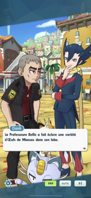 - En ville, vous retrouvez Margie, Danh et Pieris ainsi qu'une fillette entourés, de Miaouss de Kanto, Miaouss d'Alola et Miaouss de Galar. Alors qu'ils semblent tous être en adoration devant tous ces Miaouss, y compris Danh, il semblerait que la Professeure Bellis ait fait éclore une variété d'Oeufs de Miaouss dans son labo et qu'il faille donc s'en occuper : les Miaouss d'Alola sont fiers et rusés et ceux de Galar sont courageux.