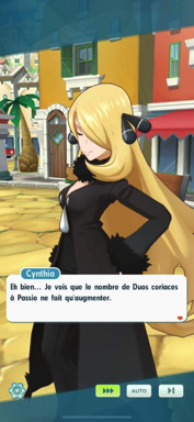 - Adamantin et Nacchara débarquent et présentent à nos héros le Giratina appartenant à Cynthia. D'ailleurs, elle se présente à eux comme étant une archéologue qui étudie les mythes des Pokémon. Après quelques discussions sur Dialga et Palkia et l'utilisation des Poké Balls à Passio, la Maître de Sinnoh souhaite en apprendre plus sur les Failles Spatio-Temporelles et comptent sur Aurel et Lucia pour l'épauler.