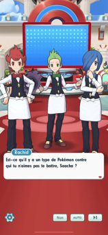 - Vous retrouvez Rachid, Armando et Noa au Centre Pokémon qui vous demandent s'il y a un type de Pokémon en particulier contre qui vous n'aimez pas vous battre ? Sans réponse de votre part, ils vous informent qu'ils souhaient se battre contre des personnes qui ont faible contre un certain type de Pokémon. Voyant que ce n'est pas votre cas, ils décident tout de même de vous défier !