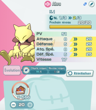 Statistique Points gagnés au Potentiel 5★ Max selon le potentiel de base 1★ (Oeuf) 3★ 4★ 5★ PV + 200 + 120 + 80 +100 Attaque + 100 + 60 + 40 + 40 Défense + 100 + 60 + 40 + 40 Atq. Spé. + 100 + 60 + 40 + 40 Déf. Spé. + 100 + 60 + 40 + 40 Vitesse + 100 + 60 + 40 + 40