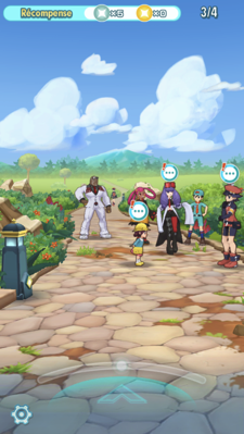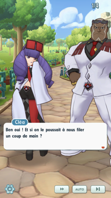 Discutez avec la Petite et la Pokémon Ranger qui vous parlent d'Alexis. Cléa vous incite à continuer vos efforts et Elvis et elle vantent encore les mérites de "son Altesse" Alexis. Récupérez des Pièces dans la Poké Ball au sol. Discutez avec Cléa et Elvis pour recevoir des encouragements (qui boostent certaines de vos stats). Effectuez maintenant un combat avec le groupe de la Team Break.