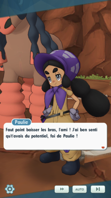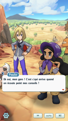 - Vous tombez nez à nez avec Kyrill et Paulie ! Celle-ci vient de le vaincre, ce qui présage sans doute un combat au niveau relevé face à elle ! Vous discutez un peu avec cette jeune Doyenne de Poni, qui aimerait bien se reposer. Soudain, la Team Break débarque et compte une nouvelle fois s'emparer des Pokémon des dresseurs rassemblés ici. Kyrill n'étant plus en état de se battre, il revient à votre équipe de protéger le groupe !