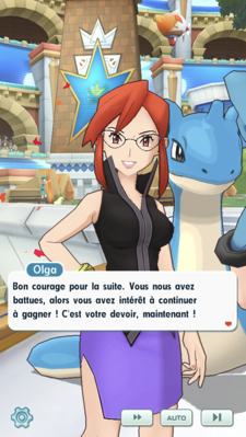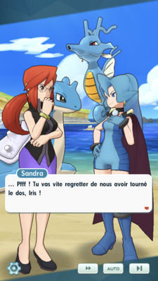 - Sur la plage, Sandra la Championne d'Arène d'Ébénelle, reproche à Iris d'avoir choisi une autre équipe (la vôtre) pour le tournoi du WPM. Olga, qui fait équipe avec Sandra, tente de la raisonner. Mais cette dernière est une forte tête et décide qu'elles se passeront d'une troisième personne pour s'entraîner, afin de faire regretter à Iris sa décision. Vous faites ensuite la rencontre de ces deux dresseuses, et Sandra se montre toujours aussi prétentieuse. Comme elles sont vos prochaines concurrentes, il va vous falloir remettre cette Championne arrogante à sa place !