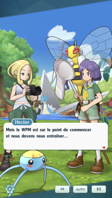 - Malgré leur spécialité commune, Violette et Hector n'ont pourtant pas les mêmes préoccupations. Violette est passionnée par la photo, mais Hector semble lassé de la voir sans cesse derrière son appareil photo plutôt qu'en train de s'entraîner pour le WPM. Pourtant, ils cherchent tous les deux à montrer au monde que les Pokémon Insecte sont en réalité très puissants. Vous les rencontrez avant votre confrontation pour le WPM et ils semblent plutôt confiants, ne leur laissez pas immortaliser leur victoire en photo !