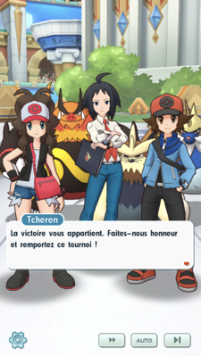 - Après un rude combat, vos adversaires ne semblent pas particulièrement déçus de leur défaite. Mais alors que Tcheren semble sur le point de dire au revoir à ses amis, ils perçoivent qu'il ne souhaite pas réellement quitter le tournoi, et ils l'encouragent à intégrer votre équipe avec son Mastouffe, ce qu'il s'empresse de vous demander. Voilà un nouveau Duo qui vous rejoint !
