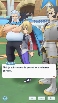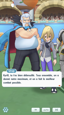 - Le trio vaincu ne peut que reconnaître votre supériorité et, Kyrill, malgré sa déception, s'incline devant votre maîtrise ! Vos amis vous disent qu'il faudra continuer à profresser pour remporter ce tournoi pour rendre hommage à votre rival qui compte désormais sur vous. Plus tard, sur la plage de Passio, Kyrill remercie encore Urup et Thyméo d'avoir bien voulu l'accompagner dans son parcours vers le WPM, tandis qu'eux sont ravis d'avoir pu l'accompagner dans ses combats pour le voir progresser. Pensif et frustré de s'être fait battre, le dresseur de Rocabot se demande comment il pourra bien vous vaincre...