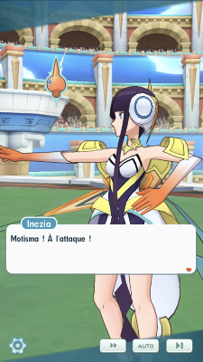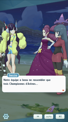 - Inezia fait le point avec ses équipières Kiméra et Morgane sur leur progression au fil des épreuves du WPM. Bien qu'elles ne soient "que" des Championnes d'Arènes, elles ont vaincu de très puissants équipe, comprenant parfois des membres de Conseil 4. Elle se sent donc en confiance pour le combat contre vous qui s'annonce ! Mais contrairement à ses deux camarades, Morgane n'est pas habituée à être sous les lumières des projecteurs, alors elles l'incitent à mieux extérioriser ses sentiments pour que leur victoire soit plus éclatante. Inezia tente d'ailleurs une de ses blagues pour faire sourire son amie, ce qui finit par fonctionner.