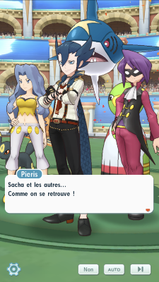 De retour dans le présent, au quatrième tour du WPM, vous revoilà aux côtés de Pierre, Danh et Ondine qui attendent de pied ferme Marion et Clément ! Plutôt admiratifs des exploits de votre équipe, ces derniers sont ravis de pouvoir vous affronter ! De plus, d'après Danh, vous ne devriez plus être interrompus pendant le tournoi, car la sécurité autour de l'Arène a été renforcée. Clément fait comprendre à Danh que leur nouvel allié leur a parlé de lui, et c'est tout naturel puisqu'il s'agit bel et bien de Pieris, dont le destin a décidé pour lui ! Pour l'occasion, il a revêtu son Look Ultime et combattra avec son Sharpedo, un Pokémon plus agressif que son Léopardus, et qui est capable de méga-évoluer. En avant pour un nouveau combat !Récompenses (1ère fois)