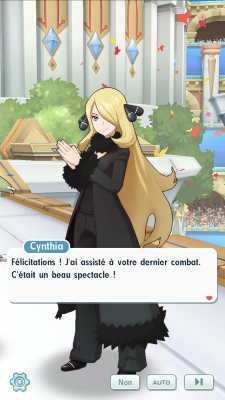 - Vous arrivez finalement à bout de Pieris et son équipe. Tous très impressionnés par votre victoire, ils vous félicitent. Malgré leur défaite, ils comptent aller de l'avant et continuer à progresser en combattant ensemble. Pieris se souvient de la proposition de Danh de venir visiter Alola, et il lui dit qu'avec ces histoires, ce ne sera pas pour tout de suite. Pierre et Ondine vous avertissent que votre prochain combat risque d'être assez compliqué vu que vous vous rapprochez progressivement des adversaires les plus coriaces. Et en effet, le combat risque d'être explosif puisque que vous retrouvez Cynthia qui vous annonce en personne que vous défierez son équipe lors des quarts de finale !