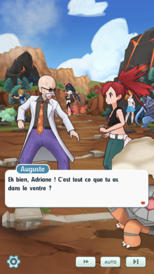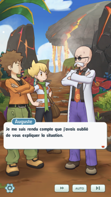 - Vous rencontrez Auguste et Adriane en plein entraînement. Après une discussion à laquelle prennent part Pierre et René, Adriane vous informe qu'elle vous attend tout en haut du volcan pour vous défier ! Mais pour parvenir au sommet, vous devrez affronter d'autres dresseurs sur la route.