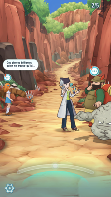 - La Professeure Bellis va vous faire découvrir quelques astuces sur l'exploration. Pour cela, elle vous emmène sur le terrain. Une fois sur place, engagez la conversation auprès des 2 dresseurs en cliquant dessus afin de récupérer des Motivatrons. À l'écran suivant, obtenez des Soda Gros-Bras et effectuez un combat avec le groupe de dresseurs devant vous.