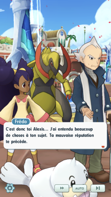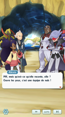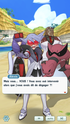 - Alors que vous vous êtes débarassé des sbires, Alexis semble lui aussi avoir réglé leur compte à ceux de la plage. Furieux de vous revoir, il provoque Iris en duel ! Leurs forces étant identiques, le combat se termine et Alexis, toujours aussi arrogant, s'en va avec ses deux "serviteurs", comme il aime à les appeler. Quant à Iris, elle souhaite maintenant vous affronter !