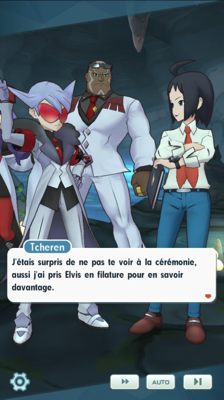 Tcheren conseille à Alexis d'unir ses forces avec celles des duos présents pour l'aider à régler ce problème en récupérant le Pokémon fabuleux... mais comme à son habitude, le prince préfère faire cavalier seul !