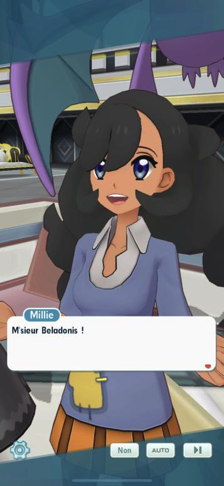 - À l'exception de Beladonis, tout le monde est surpris de voir débarquer Millie. Il fait complètement confiance aux deux femmes qui sont sur scène pour venir à bout des sbires de la Team Flare sans éveiller les soupçons du public quant au fait que les évènements sont totalement imprévus. Il redoute que si Sannah et ses amis débarquent à leur tour, les gens commencent à se poser des questions. Rapidement, les sbires sont vaincus et battent en retraite sous le clameur du public. Le Psystigri qui accompagne Millie reconnaît Beladonis parmi les spectateurs et les deux détectives sont ravis de se retrouver depuis leurs aventures à Kalos !