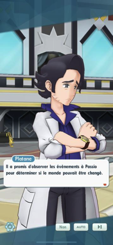 - Lysandre a conçu cette tenue à partir de technologies de la Team Flare, et l'affrontement n'était qu'un entraînement entre deux de ses Pokémon visant à renforcer sa Duo-Gemme. Il assure même n'avoir aucun rapport avec les problèmes créés en ville et a demandé à ce qu'une enquête soit menée au sein de son organisation afin de trouver les traîtres. Il n'a pas l'intention de causer d'agitation sur Passio à l'heure actuelle. Lysandre présente son nouveau partenaire, Volcanion, à ses interlocuteurs. Ils sont plus qu'impressionnés devant les pouvoirs qui sont attribués à ce Pokémon fabuleux : raser des montagnes, aplanir des sols et les rendre fertiles...