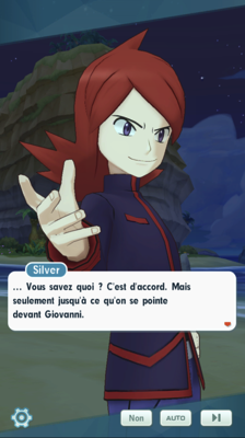 Plus loin, Silver ressent la secousse provoquée par la transformation du Pokémon. Les tremblements sont si puissants que le repaire de la Team Rocket finit même par s'effondrer ! Heureusement, personne ne semble blessé et Silver rejoint son père et le reste du groupe. Toujours très en colère, il critique Giovanni, qu'il juge incapable de se débrouiller seul pour se débarasser de ses adversaires. En effet, si le groupe de lutte contre la Team Rocket est maintenant affaibli, ce sont ses sbires et Admins qui lui ont mâché le travail en fatiguant les dresseurs. Silver sait que c'est trop facile de faire le malin avec un Pokémon en pleine forme face à plusieurs autres qui sont déjà amoindris par leurs affrontements précédents.