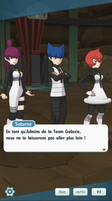 C'est alors que les admins de la Team Galaxie vous rejoignent ! Ils souhaitent en effet eux aussi connaître la position de leur chef et sont prêts à tout, même créer une alliance temporaire avec vous pour le retrouver. Malgré les réticences des garçons, Aurore et Cynthia sont prêtes à accepter cette aide pour mener à bien leur objectif commun. Cynthia leur impose d'agir ensemble, pour garder un oeil sur eux. Soudain, la professeure Bellis ressent une grande fatigue et plonge à son tour dans un profond sommeil... vous n'avez pas une minute à perdre, il vous faut trouver le chef de la Team Galaxie !