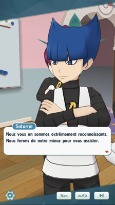 Dans la forêt, Saturne s'est allié à Aurore pour peaufiner les recherches. Alors que l'admin de la Team Galaxie tente un coup de bluff, il se fait surprendre par la bonté d'Aurore qui détecte immédiatement qu'il souhaite seulement la défier. Ce dernier comptait prendre sa revanche comme ses frères d'armes, mais ce n'est pas le moment et ils remettent donc ce défi à plus tard. Aurore ne lui en veut pas d'avoir mal choisi le moment pour préparer un combat, cela montre qu'il peut penser aussi à ses propres envies plutôt que de se plier systématiquement à la volonté de Hélio ou de le faire passer avant ses besoin personnels. Elle considère que c'est grâce à cette petite part d'égoïsme que Saturne a une chance de convaincre son chef qu'il a tort.