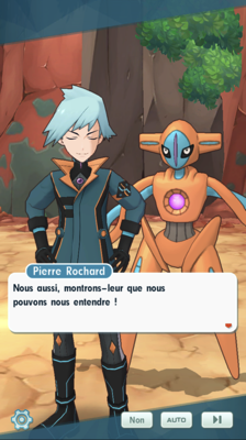 Alors qu'Amaryllis certifie qu'ils ne pourront rien faire d'autre tant que Groudon et Kyogre ne seront pas neutralisés, Pierre la contacte pour lui expliquer ce qui va suivre : la menace d'une énorme météorite tombant sur Passio se rapproche dangereusement. Le Maître de Hoenn a donc pris les devants et a décidé de revêtir une tenue spécialement créée pour aller dans l'espace. Ainsi, grâce à son Rayquaza méga-évolué, il espère détruire l'objet cataclysmique en vol. Mais pour cela, elle devra impérativement calmer les deux légendaires afin d'éviter qu'ils se mettent en travers de son chemin. Après la conversation via Porygophone, Deoxys apparaît à nouveau devant le Maître et la Professeure...