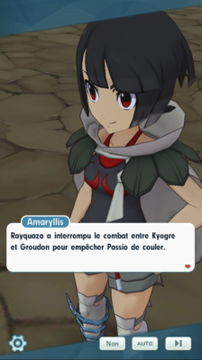 - Dans le repaire de la Team Aqua, Amaryllis a flairé que quelque chose ne tourne pas rond à Passio depuis la chute d'un objet dans l'océan. À l'instar de Groudon et Kyogre, elle a remarqué que son Rayquaza était lui aussi agité depuis cet évènement. Elle a la sensation que quelqu'un a manipulé les légendaires et les teams rivales pour en tirer profit. Après en avoir fait part à Arthur et Sarah, un de leur sbire les contacte via le Porygophone pour les informer que Kyogre a été trouvé ! Mais les choses bougent aussi du côté de Groudon et la Team Magma, malheureusement, le signal se coupe avant que le sbire ne puisse finir ses explications.