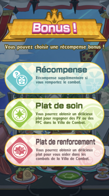 Les Plats de renforcement peuvent être obtenus dans la Villa de Combat, en bas de l'écran au début de chaque combat en solo. Utilisez-les pour appliquer différents effets à votre équipe au début du combat. Notez qu'ils ne peuvent être conservés et seront automatiquement supprimés à la fin de la période du défi. En voici la liste :| Image | Nom | Effet |