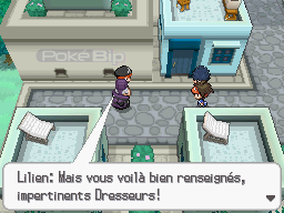 Lorsque vous vous apprêtez à sortir d'Entrelasque vers Janusia, vous tombez nez à nez sur le Sage Lilien et un Sbire de la Team Plasma.![]() | Lilien | Sbire |