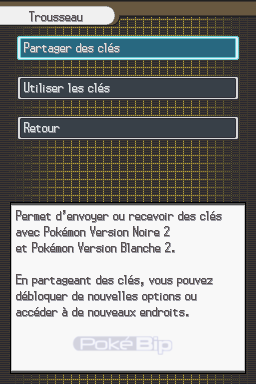Au fur et à mesure de votre avancée dans le jeu, différentes Clés sont débloquées, qui peuvent soit modifier le contenu de votre propre partie (onglet Utiliser les clés), soit être envoyées à d'autres joueurs via la communication infrarouge (onglet Partager des clés).Attention : seules les Clés obtenues vous-même dans votre partie peuvent être envoyées, pas celles reçues d'autres joueurs.
