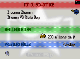 | Fin étrange | Si vous avez tourné avec vos Pokémon, ils deviennent des stars, ce qui fait apparaître une étoile quand votre Pokémon est envoyé au combat Excellent bilan au box-office |