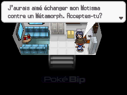 Au rez-de-chausée du bâtiment en bas des escaliers, une femme vous échange d'abord Capidextre contre Minotaupe, puis Alakazam contre Hippodocus. Elle vous propose un combat après chaque échange effectué.