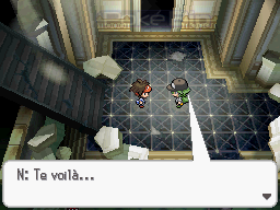 Le Pokémon vous mène au Palais de N, du moins ce qu'il en reste... Le magnifique bâtiment jailli de terre dans la précédente version n'est plus qu'une ruine à nouveau enterrée.