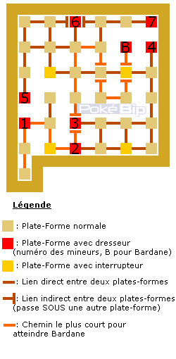 L'arène est plongée dans le noir et les plates-formes s'éclairent au fur et à mesure de votre avancée. Vous croisez évidemment quelques Dresseurs.Des boutons permettent d'éclairer une petite partie des plates-formes.