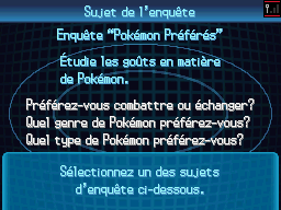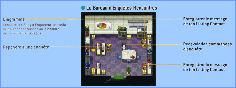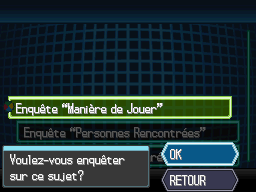 Une fois devenu Enquêteur, on vous confie des commandes d'enquêtes (des sondages en quelque sorte) à réaliser auprès de vos amis ou des Dresseurs rencontrés via le Listing Contact du C-Gear.