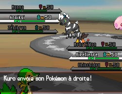 Le principe est le même qu'en combat Trio (trois contre trois), mais un seul Pokémon par tour peut agir/combattre.
