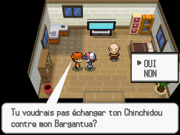 Un Gamin dans la maison au sud-est du Centre Pokémon de Port Yoneuve souhaite échanger son Bargantua contre un Chinchidou. Selon votre version, la forme de ce Bargantua diffère.