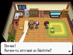 Un Montagnard dans la maison à l'ouest de la Route 7, souhaite obtenir un Géolithe en vous échangeant son Emolga.