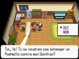 Dans la maison à l'est du Centre Pokémon de Maillard, une Fillette à l'étage cherche un Chlorobule ou un Doudouvet (selon votre version), elle vous propose le Pokémon introuvable de votre version en échange !