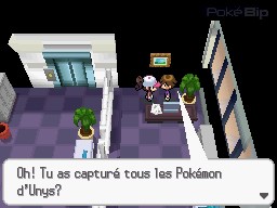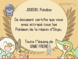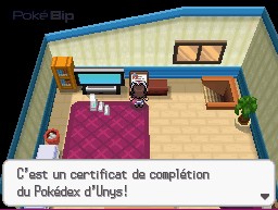 Si vous avez réussi à compléter le Pokédex d'Unys (avoir obtenu les Pokémon n°001 à 150), le réalisateur du jeu vous offre un certificat qui sera ensuite exposé dans votre chambre à Renouet.