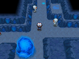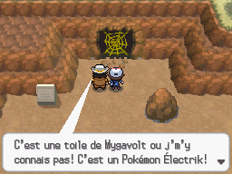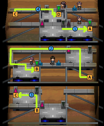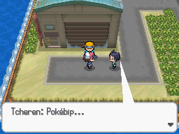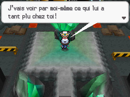 L'entrée du hangar au sud-ouest est barrée par un ouvrier de chantier. C'est le repaire de la Team Plasma, donc soignez vos Pokémon avant d'y pénétrer par la petite porte sur la gauche.