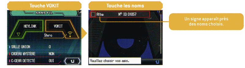 Comme pour le Vokit en connexion sans fil, vous avez besoin du Code Ami des autres joueurs pour communiquer avec eux.Attention, la conversation est cette fois-ci est limitée à deux personnes.