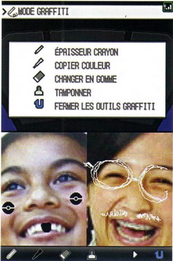 Le bouton MODE GRAFFITI sur l'écran inférieur enclenche le mode Graffiti permettant de dessiner sur le visage de vos interlocuteurs à l'aide de quatre outils différents.Touchez le bouton Pause pour avoir une image fixe.