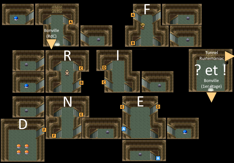 | Toutes les pièces sans issue | A, B, C, G, H, J, K, L, M, O, P, Q, S, T, U, V, W, X, Y, Z |