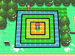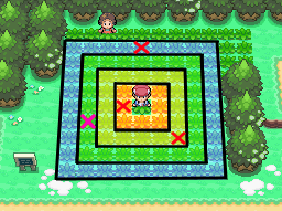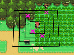 Lorsque vous utilisez le Poké Radar, des cases d'herbes vont s'agiter dans un carré de 9x9 cases autour du personnage. Ce carré est séparé en 4 zones distinctes comme sur l'image suivante :