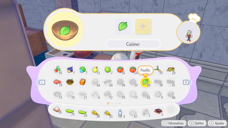 Pour préparer un plat, tenez-vous devant l'ustensile et interagissez avec ce dernier pour ouvrir le menu de préparation. Après avoir sélectionné vos ingrédients, le plat que vous allez préparer est indiqué à gauche, sauf si vous ne l'avez pas encore découvert. Validez pour préparer automatiquement le plat ! Notez que vous pouvez décider de préparer plusieurs exemplaires du plat à la fois, à condition d'avoir la quantité d'ingrédients requise.
